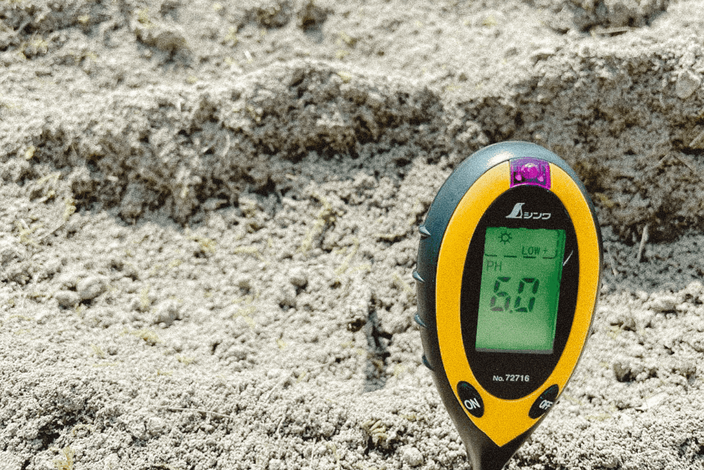 畑の土壌を調べたらpH6.0。少し酸性なので中和するために有機石灰をまいた。