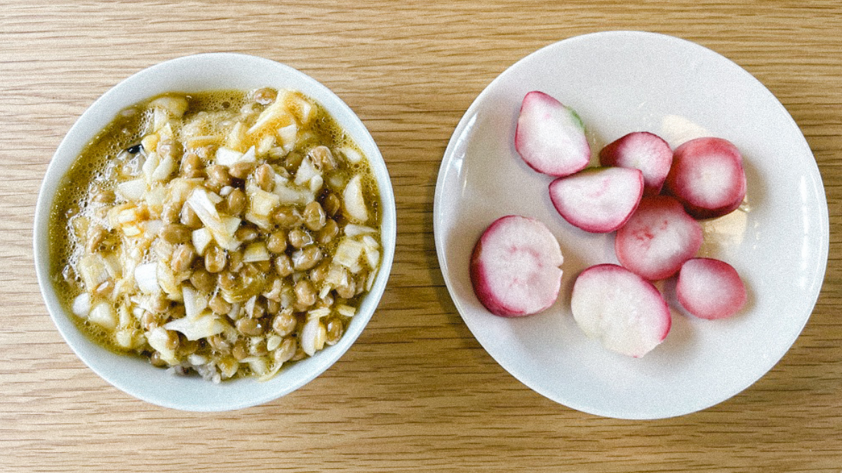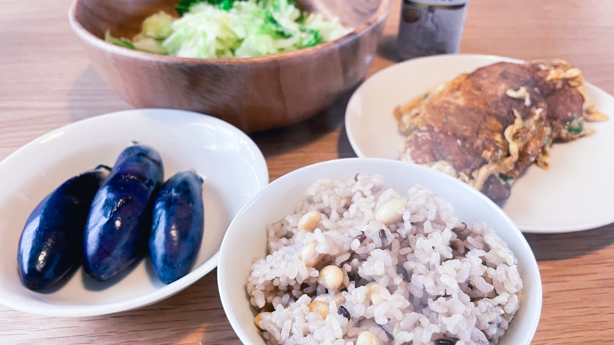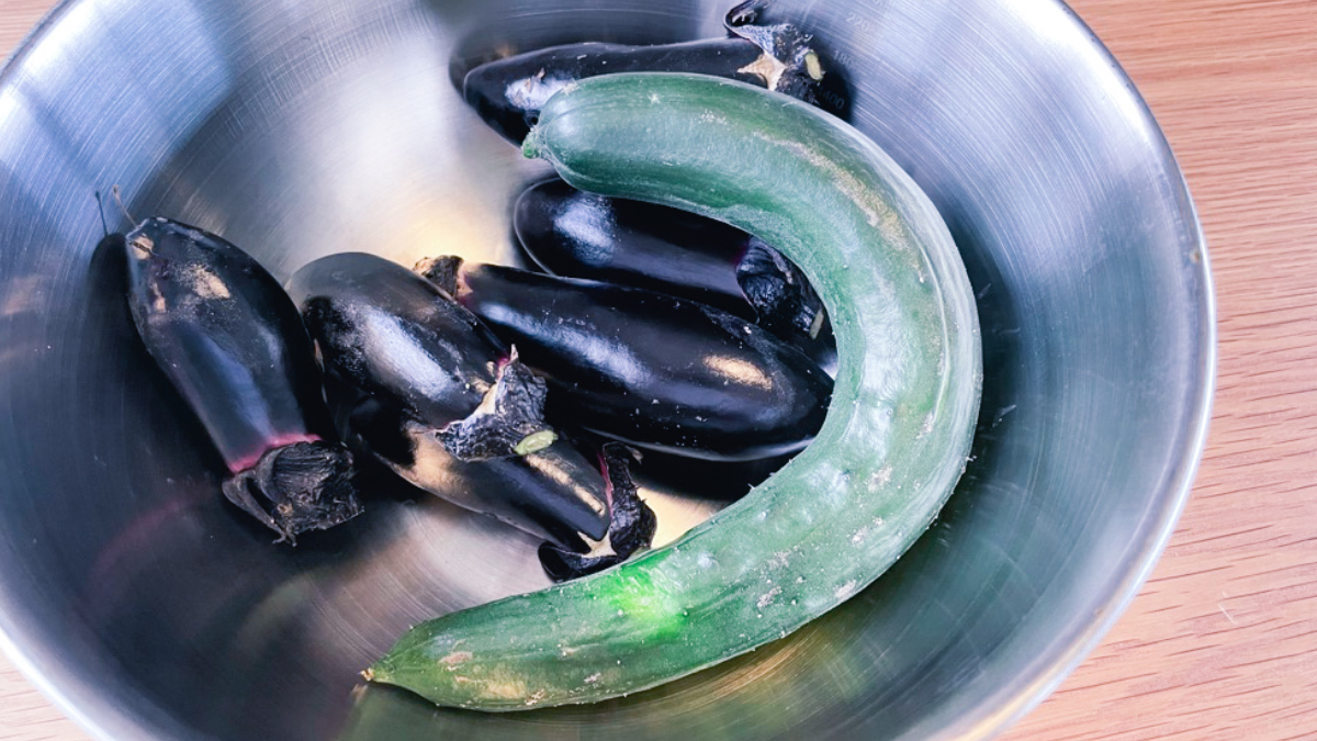 ナスとキュウリを初収穫した。焼きナスとラディッシュのぬか漬けランチ。キュウリは明日のためにぬか漬け。毎日の食事の自給率が少しずつ上がってきた。