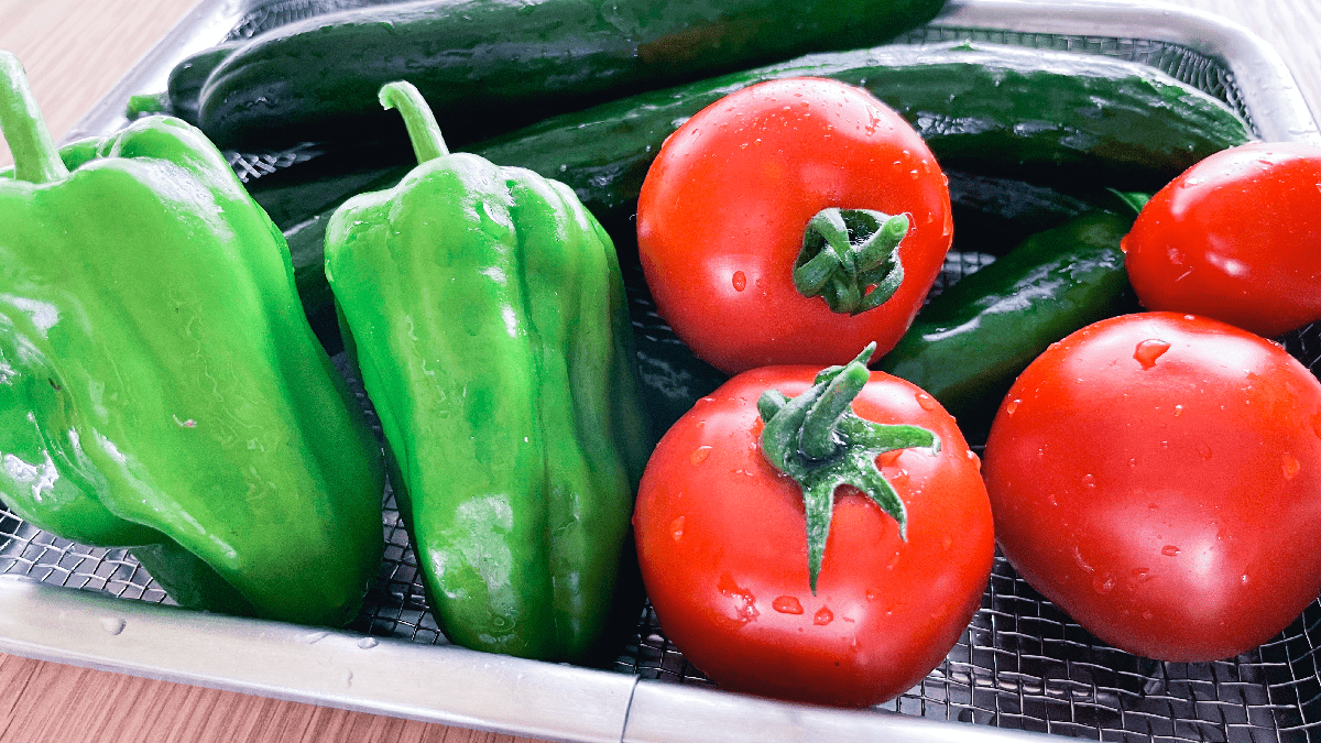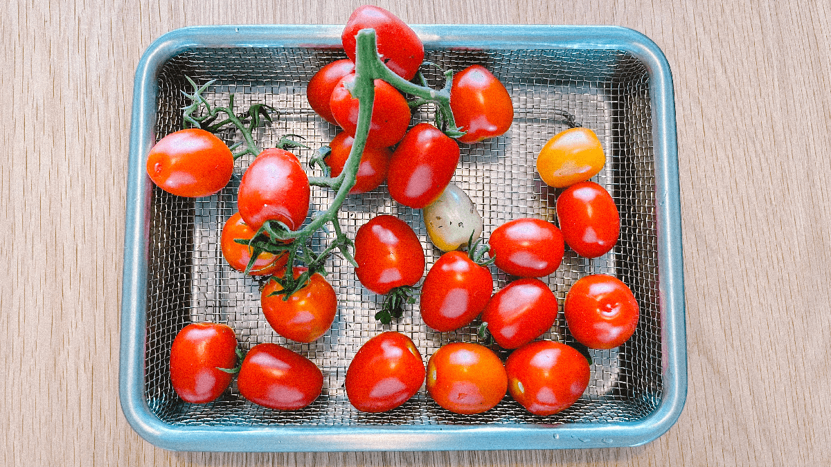 中玉トマトとミニトマトの初収穫。おいしい!朝起きて畑に行けばおいしいトマトが採れる幸せ。畑には青いトマトの房がまだまだあるので、無限トマトの始まり。