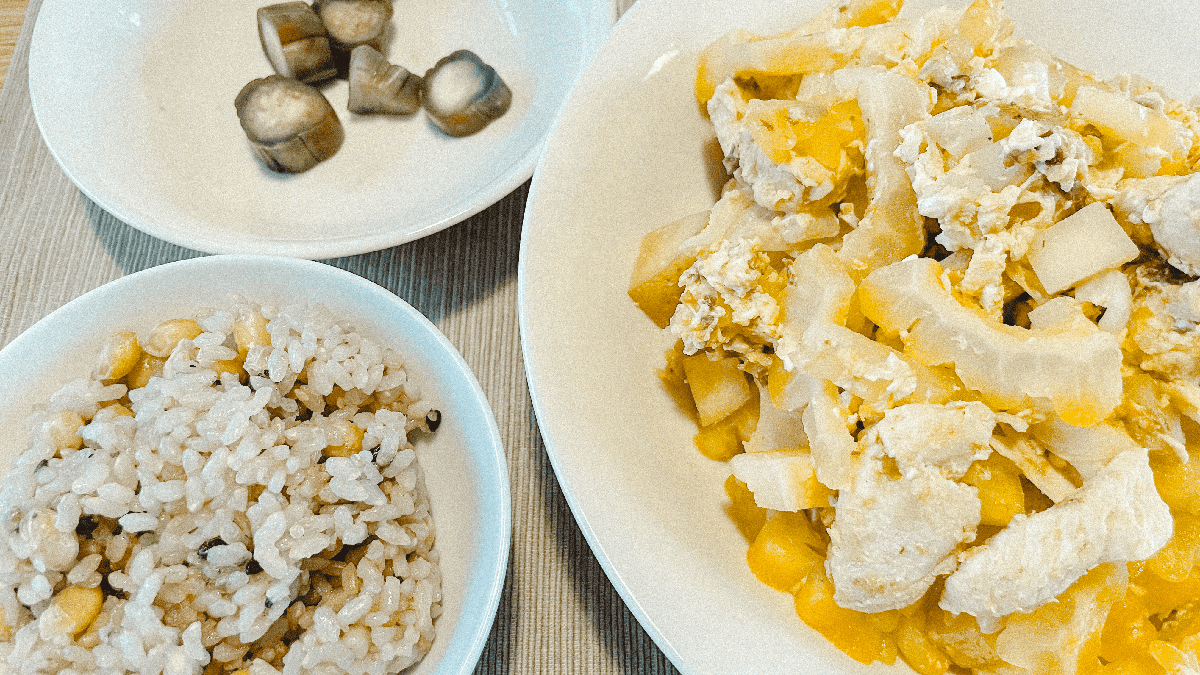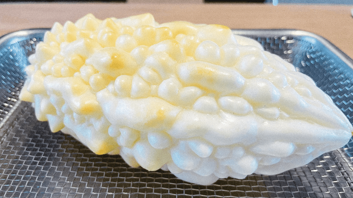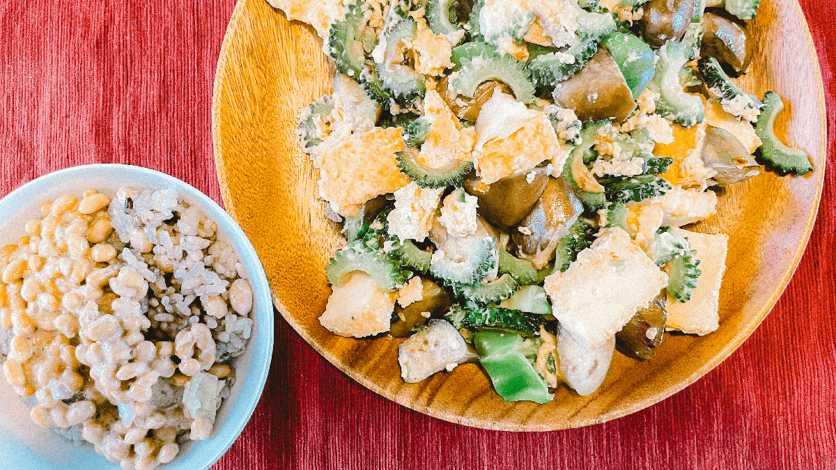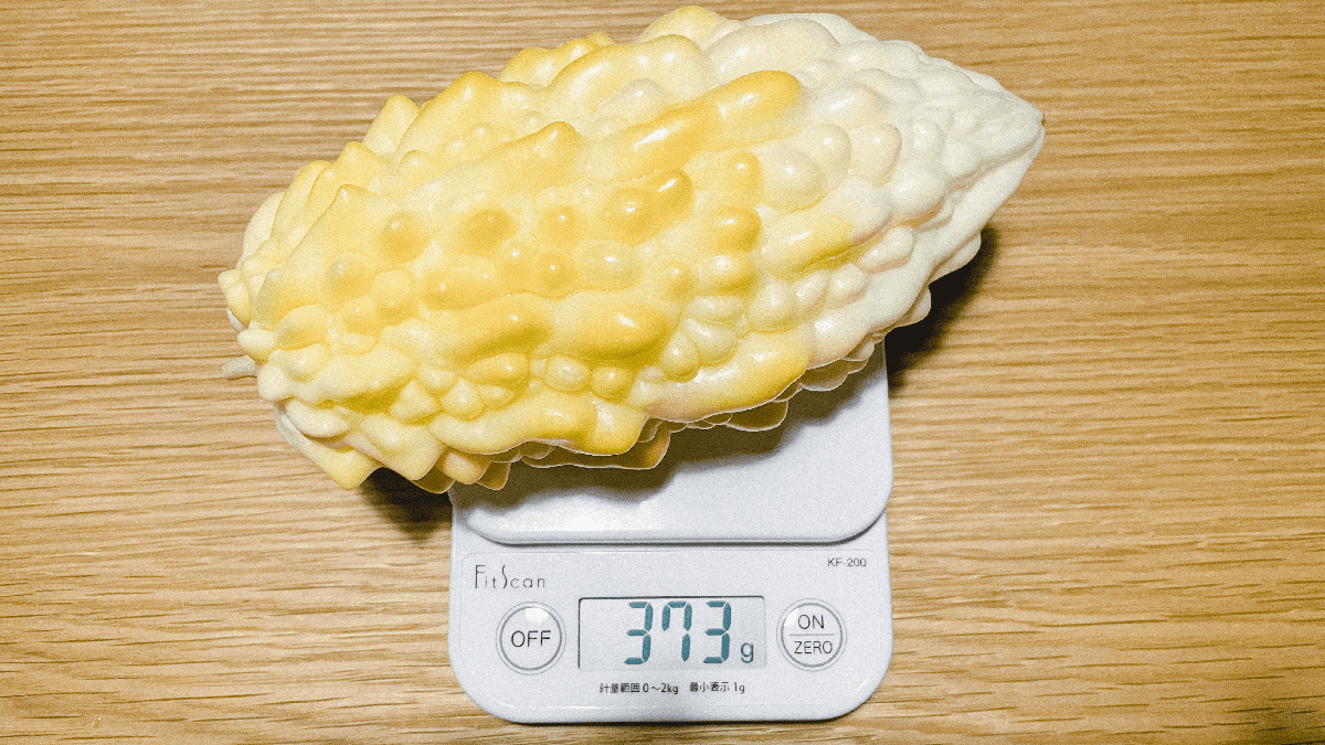 昨日収穫した巨大な白ゴーヤをチャンプルにする。誕生日ゴーヤとして食べた。