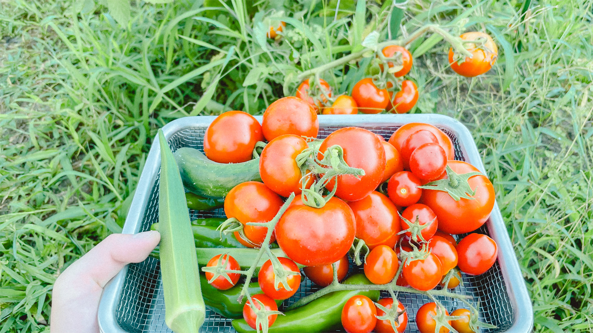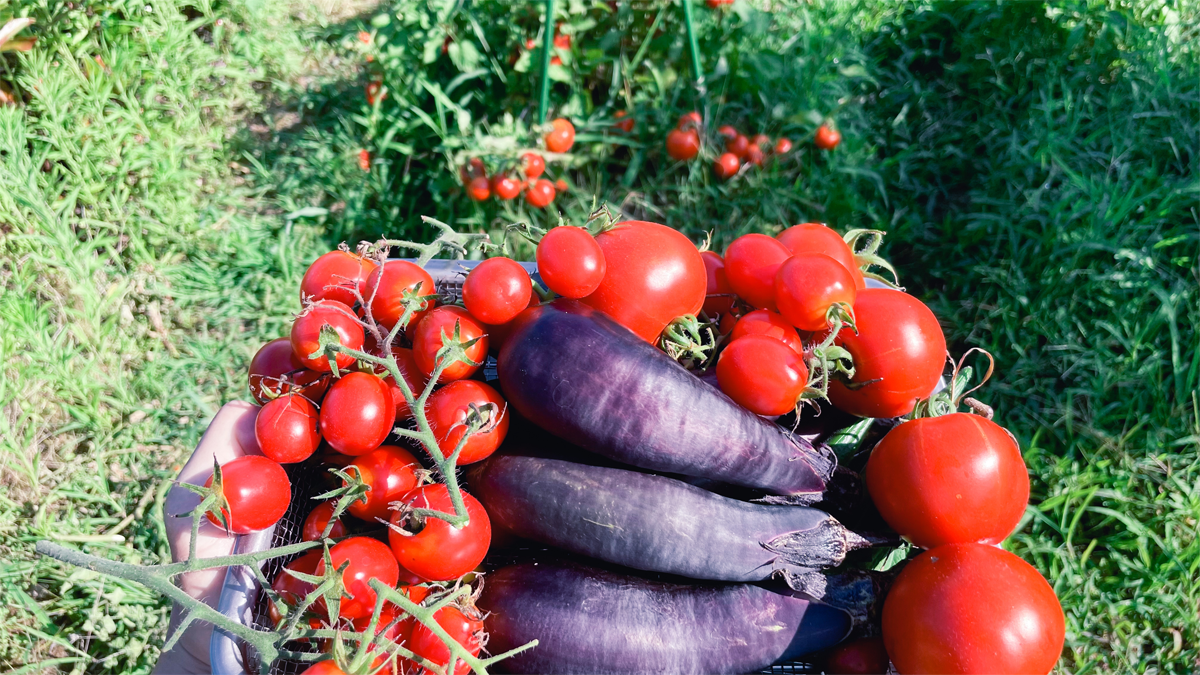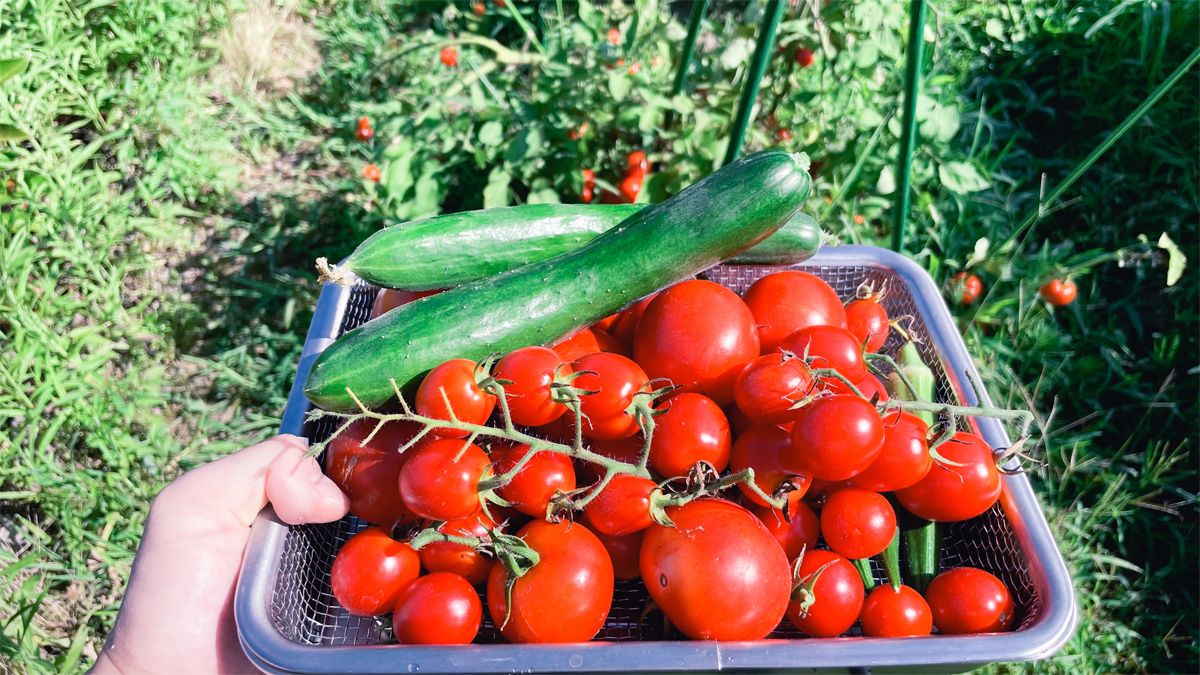今日の収穫。朝食はトマト。