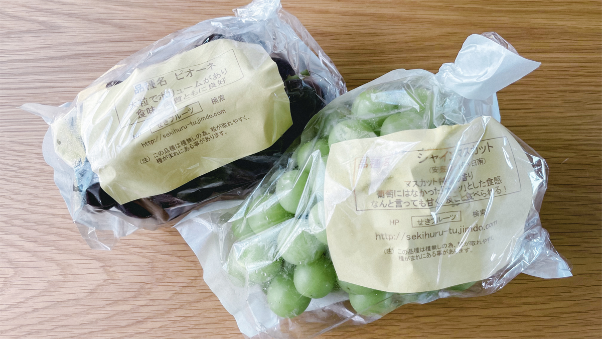 名刺デザインのお礼にと、友達からピオーネとシャインマスカットが届いた。おいしすぎて止まらない。